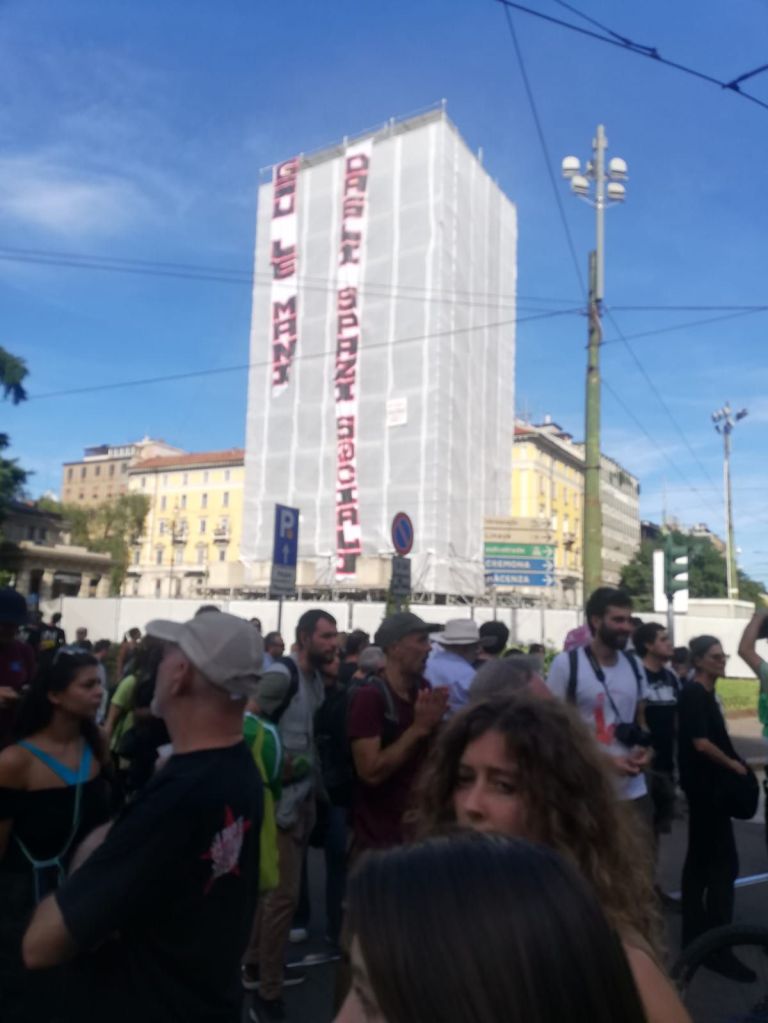 Piantedosi,La Russa,Vittorio Feltri e canea reazionaria nei commenti hanno sottolineato i petardi,le uova,i fumogeni verso le forze dell’ ordine, nonché il blitz sul Pirellino,patrimonio del comune, venduto a Manfredi Catella,assessore all’ urbanistica  indagato per l’ affair Sala,che si è lamentato del blitz dicendo che Milano è mai questa?